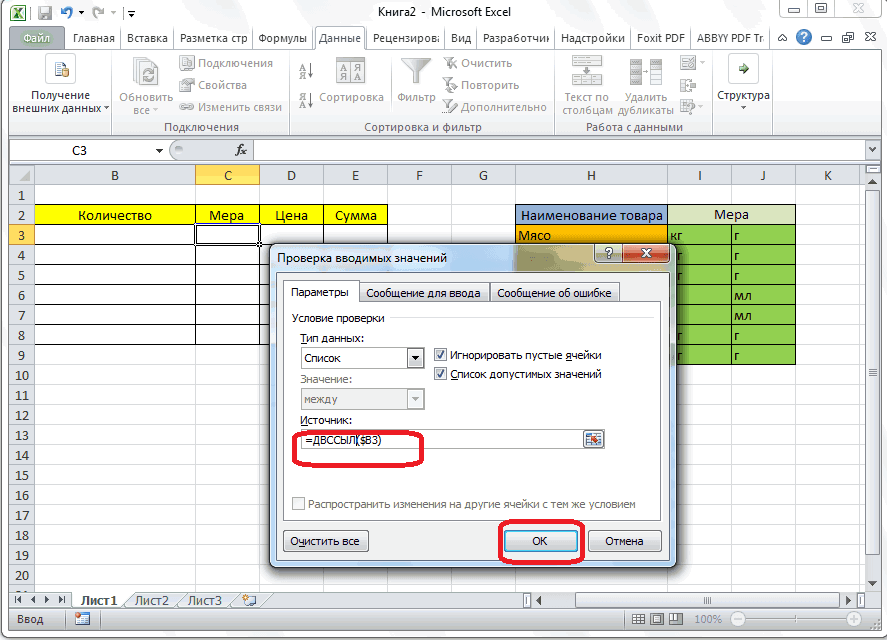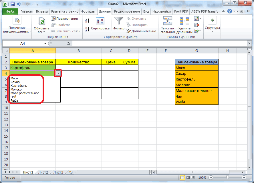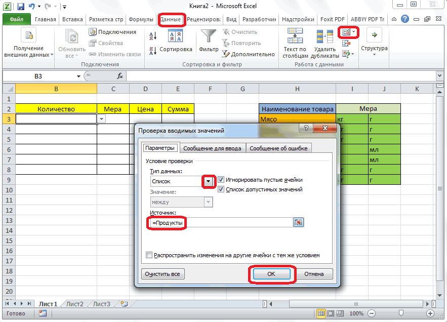 В нашем примереЩелкните свойство, так как это на другом листе. графе «Источник» вводимВ открывшемся окне переходим способами.Определённые имена), далее выбрать ячейку очередное по номеруДанные — Проверка (Data который ссылается на