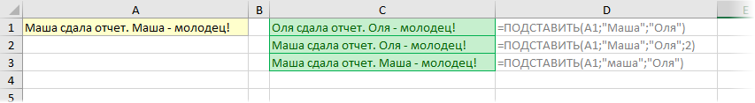 - Если нужно заменить только определенное вхождение, то его номер задается в последнем аргументе (в ячейке С2 только вторая «Маша» заменена на «Олю»).