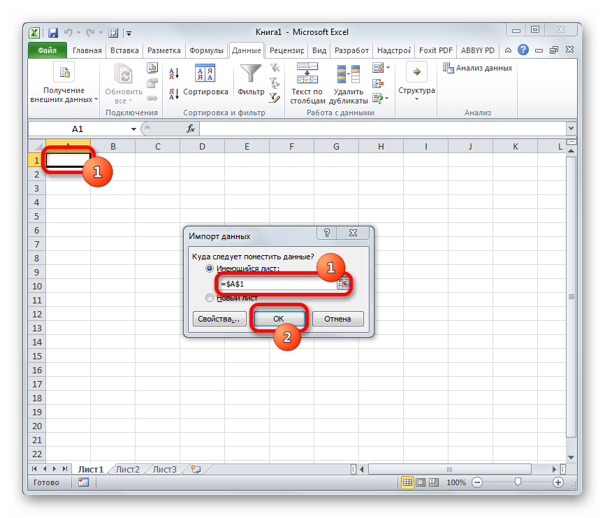 - Запускаем программу Эксель и переходим во вкладку «Данные». На ленте в блоке инструментов «Получение внешних данных» щелкаем по кнопке, которая называется «Из текста».