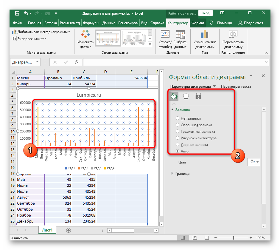 Чтобы исправить цветовую гамму, выделим всю диаграмму, щелкнув в любом ее месте, и перейдем на вкладку Конструктор.