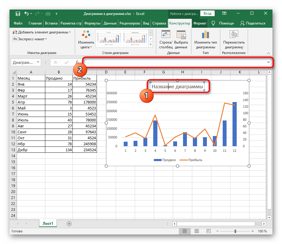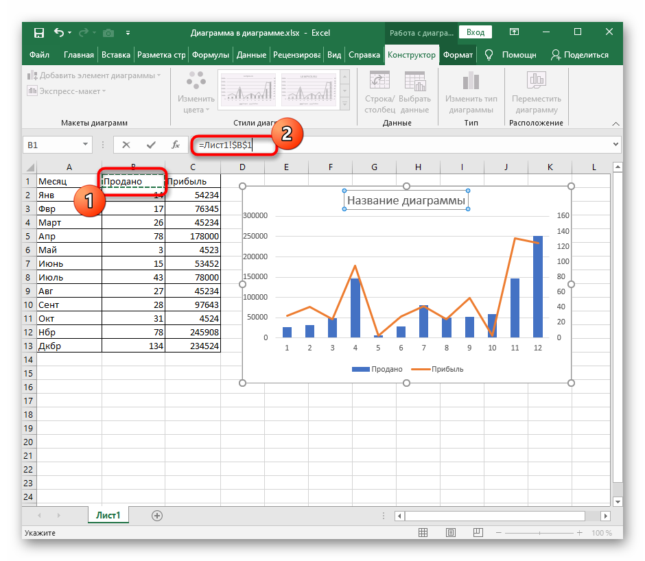 Вариант особо полезен для пользователей, работающих с таблицами, где название диаграммы завязано на наименовании конкретного столбца или строки, которое иногда меняется. В этом случае при помощи встроенной функциональности Excel можно создать автоматизированное название диаграммы, закрепленное за ячейкой и меняющееся в соответствии с ее редактированием.