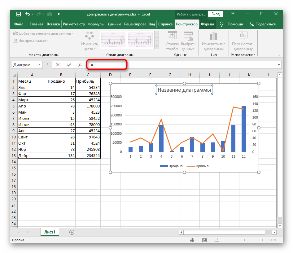 Осталось только кликнуть по ячейке, название которой хотите присвоить самой диаграмме. В строке для ввода формулы сразу же отобразится изменение — нажмите по клавише Enter для его применения.