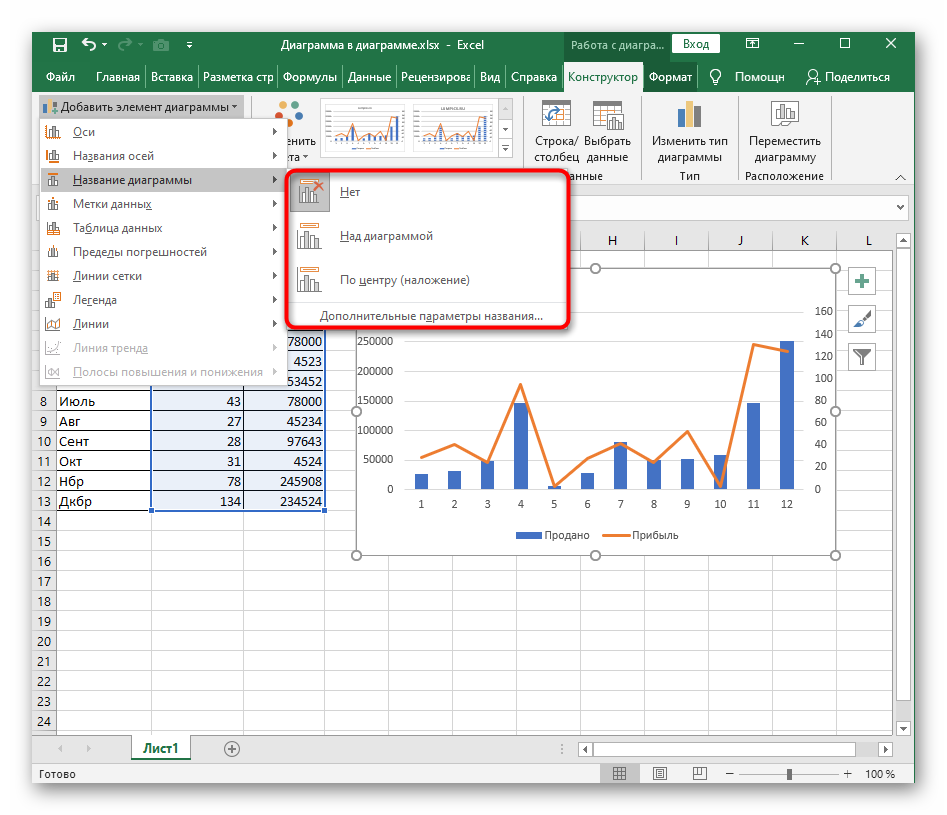 - Если название диаграммы вовсе отсутствует, воспользуйтесь предыдущим вариантом для его создания.