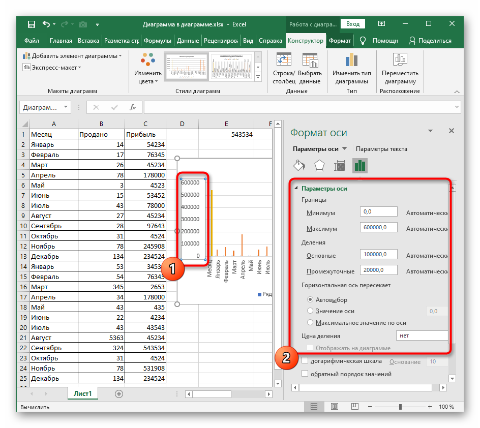 Вкратце разберем общие настройки диаграммы после ее добавления на лист, рассмотрев редактирование содержимого. Обычно строить вспомогательные оси или как-то редактировать цены деления не приходится, но если это понадобится, вы уже будете в курсе всех необходимых действий для выполнения.