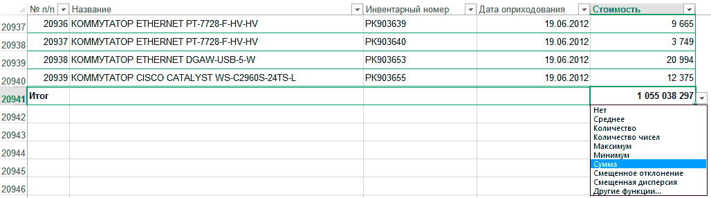 - В появившейся новой строке Итог выбрать поле, в котором нужно обработать данные, и в раскрывающемся меню выбрать нужную функцию.