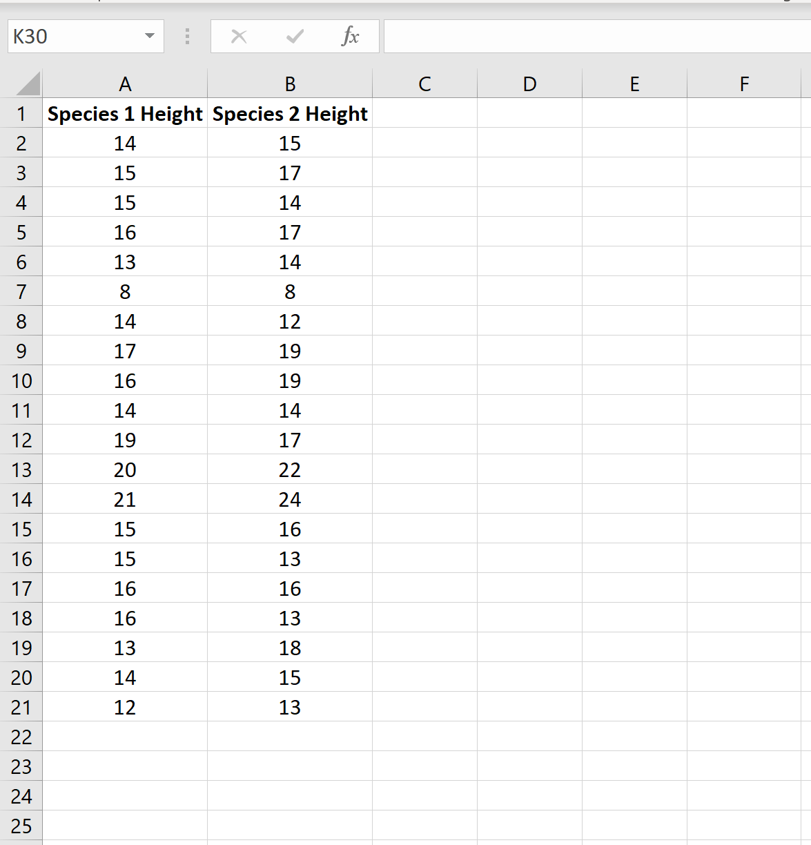 Предположим, исследователи хотят знать, имеют ли два разных вида растений в определенной стране одинаковую среднюю высоту. Поскольку обход и измерение каждого растения заняло бы слишком много времени, они решили собрать образец из 20 растений каждого вида.