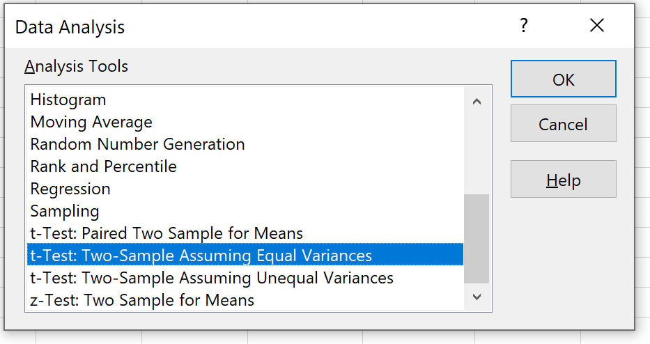 Выберите вариант с надписью t-Test: Two-Sample Assassining Equal Variances и нажмите OK.