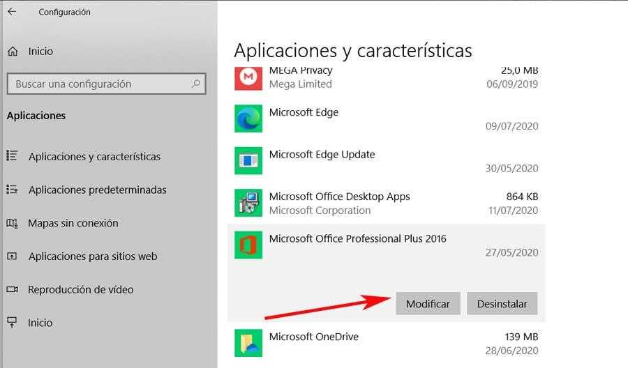 Это то, что мы достигаем в этом случае из приложения конфигурации самой Windows 10. Мы получаем к нему доступ при помощи композиции кнопок Win + I, потому мы перебегаем к Приложения , На левой панели мы находимся в разделе Приложения и функции, потому справа отображается перечень со всем, что мы установили на ПК (Персональный компьютер — компьютер, предназначенный для эксплуатации одним пользователем). Сейчас нам необходимо отыскать запись, подобающую Office, опосля что мы жмем на Поменять клавишу.