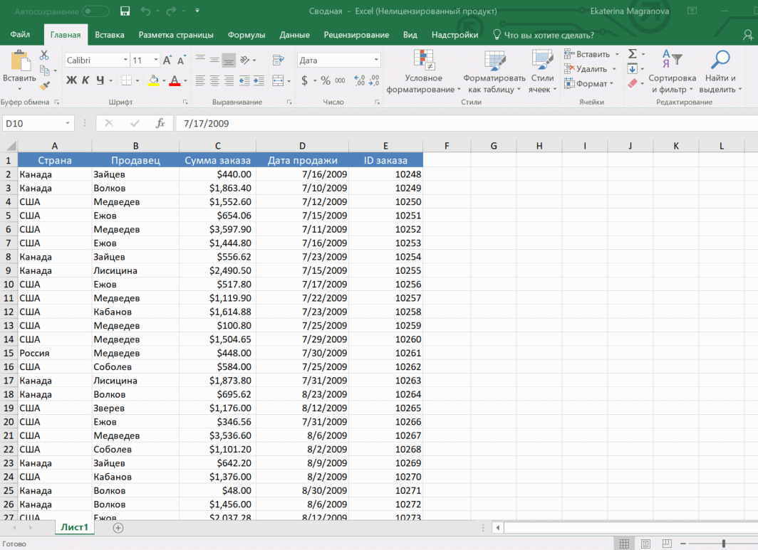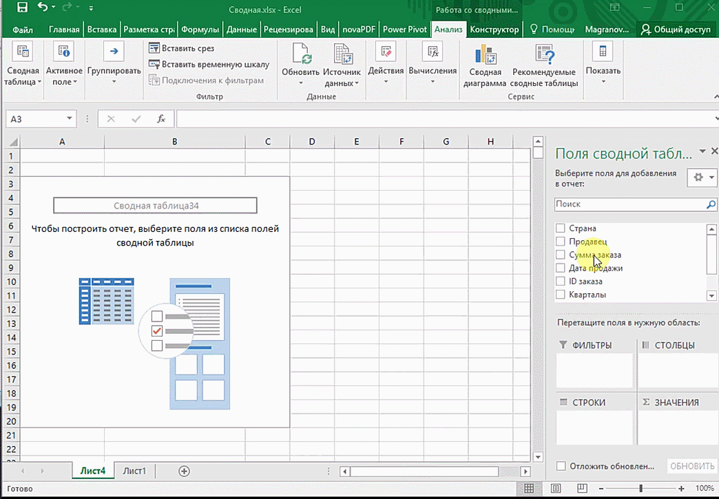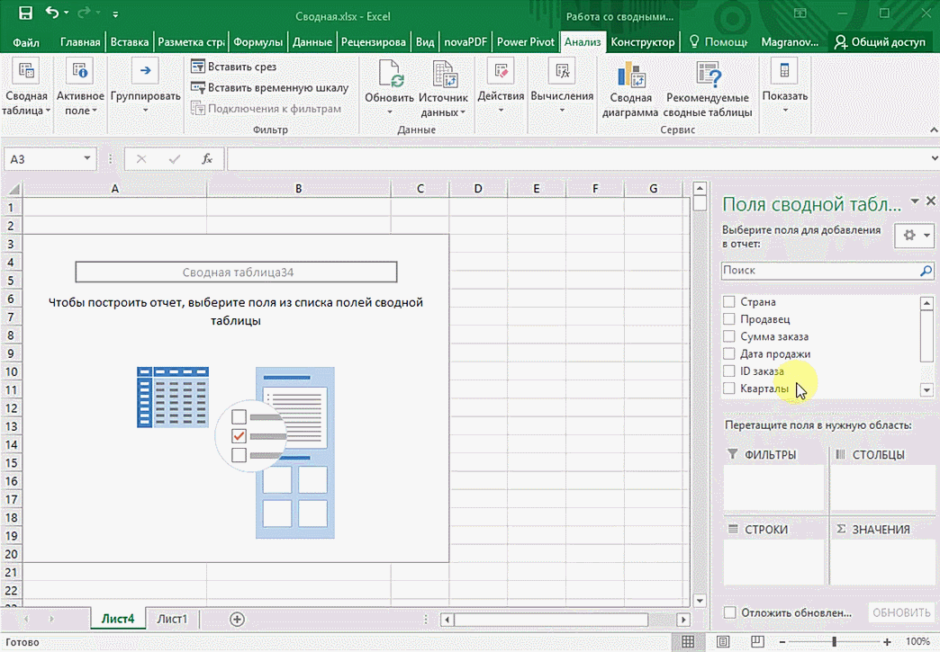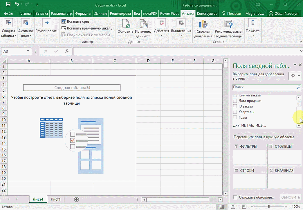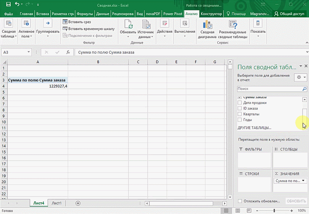Перед нами таблица с неструктурированными данными. Мы можем их систематизировать и настроить отображение тех данных, которые есть у нас в таблице. «Сумму заказов» отправляем в «Значения», а «Продавцов», «Дату продажи» — в «Строки». По данным разных продавцов за разные годы тут же посчитались суммы. При необходимости можно развернуть каждый год, квартал или месяц — получим более детальную информацию за конкретный период.