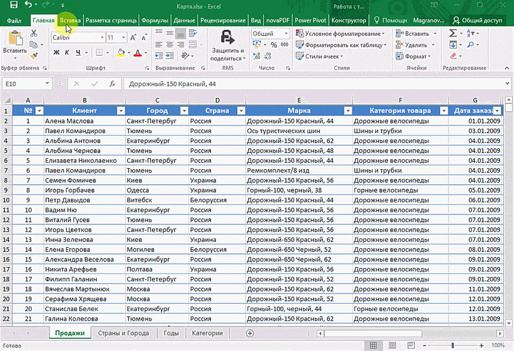 - Откройте файл с таблицей, данные которой нужно визуализировать. Например, с информацией по разным городам и странам.