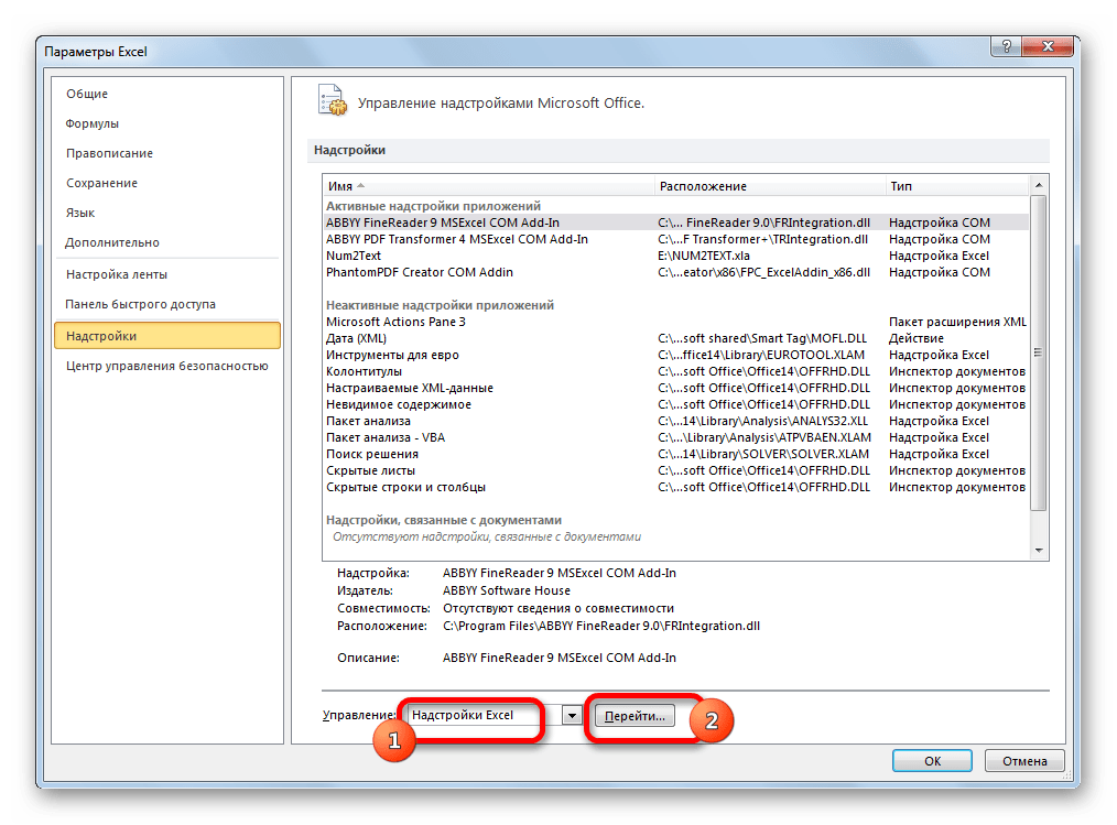 В раскрывающемся списке Управление выберите пункт Надстройки Excel и нажмите кнопку Перейти.