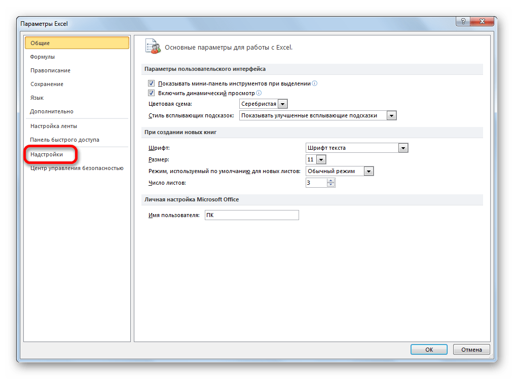 - просмотрите левую часть окошка, откройте категорию надстроек (вторая снизу в списке), выберите соответствующий пункт;
