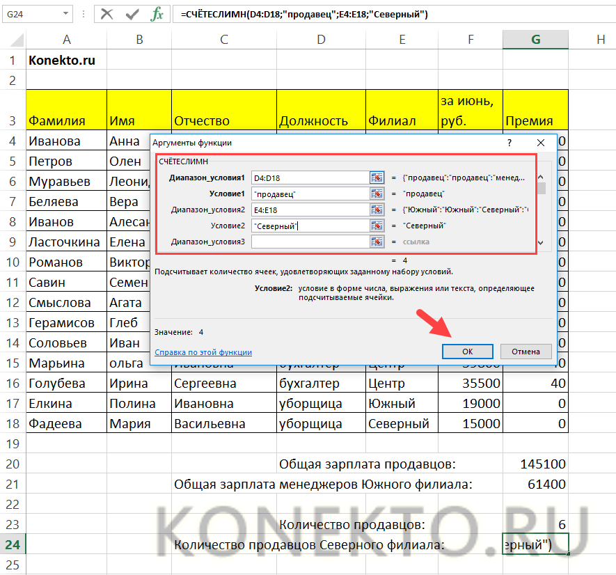 Вводим аргументы функции: «Диапазон_условия1» — это ячейки с должностями, «Условие1» = «продавец». В «Диапазон_условия2» пишем ячейки с филиалами, «Условие2» = «Северный».