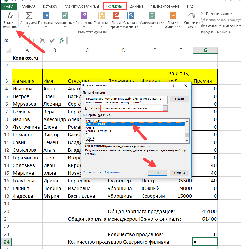 Иногда возникают более сложные задачи — например, нужно определить, сколько продавцов работает в Северном филиале. Тогда следует воспользоваться формулой СЧЁТЕСЛИМН: