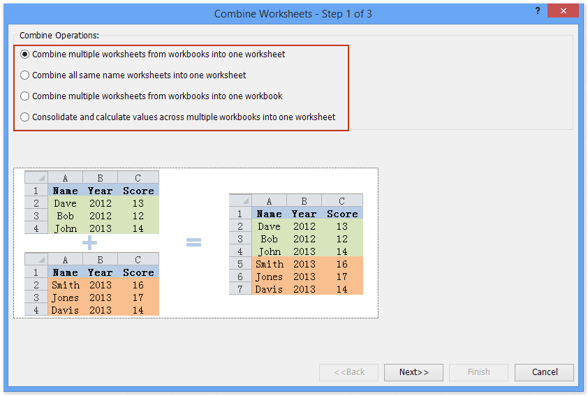 Объединение десятков листов из разных книг в один лист может оказаться утомительным. Но с Kutools for ExcelАвтора Объединить (рабочие листы и рабочие тетради) утилиту, вы можете сделать это всего за несколько кликов!