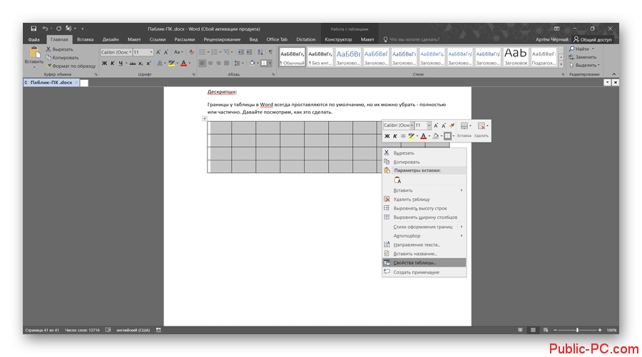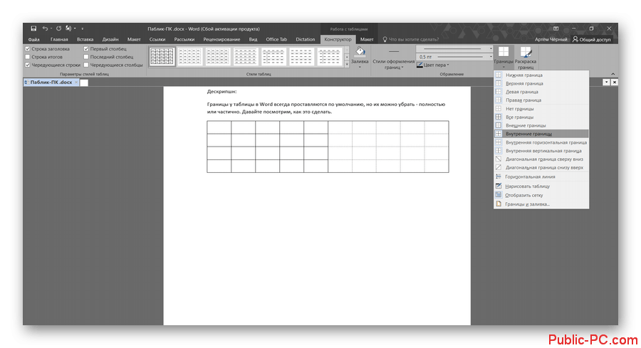 Чтобы убрать границы у всей таблицы, проделайте следующие манипуляции: