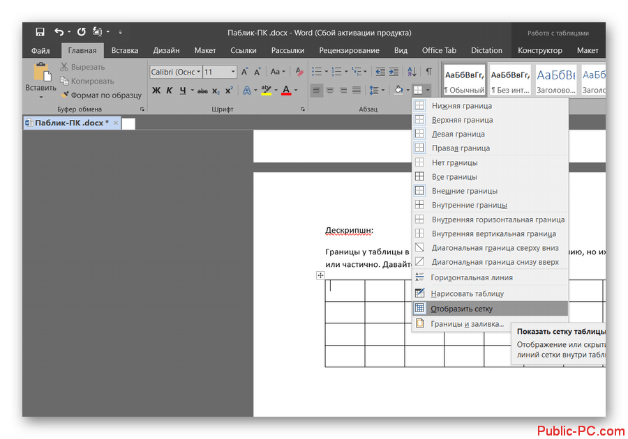 Если содержимое ячеек в дальнейшем планируется редактировать, то рекомендуется включить отображение сетки. Вместо границ будут пунктирные линии, которые значительно упростят дальнейшую работу с документом. При печати данного пунктира не будет, только в режиме работы с документом.