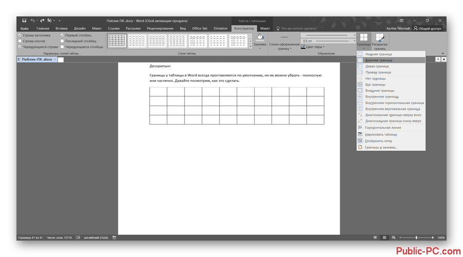 Иногда встречаются такие требования к оформлению документа, чтобы была скрыта только одна конкретная границы у таблицы. Это тоже можно очень быстро реализовать: