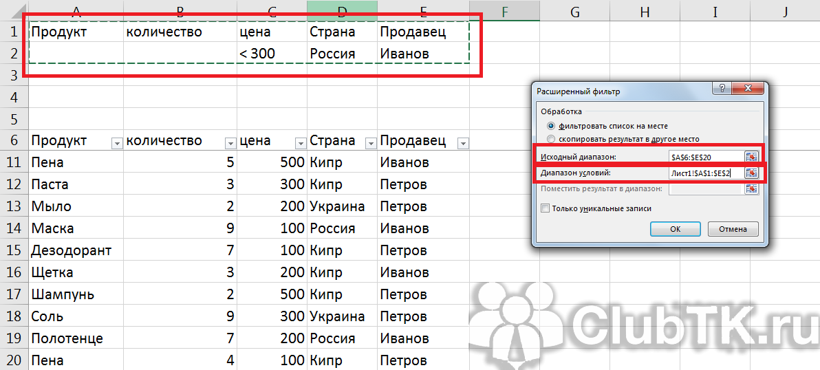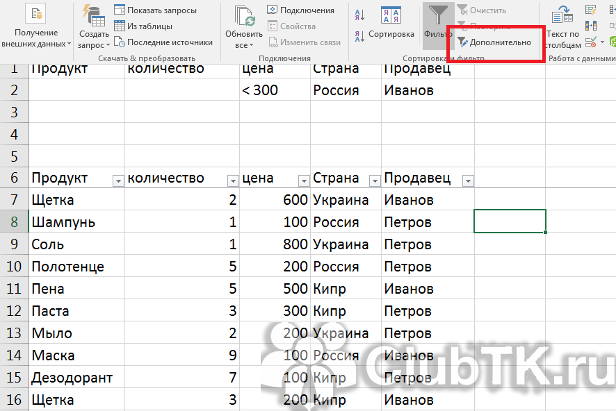Затем в свободной строке под скопированными заголовками задать необходимые условия поиска. Например, необходимо найти товары, произведенные в России, проданные менеджером Ивановым, стоимостью менее 300 рублей.