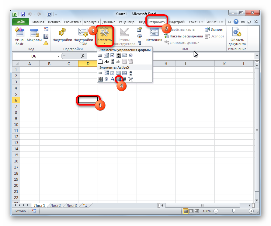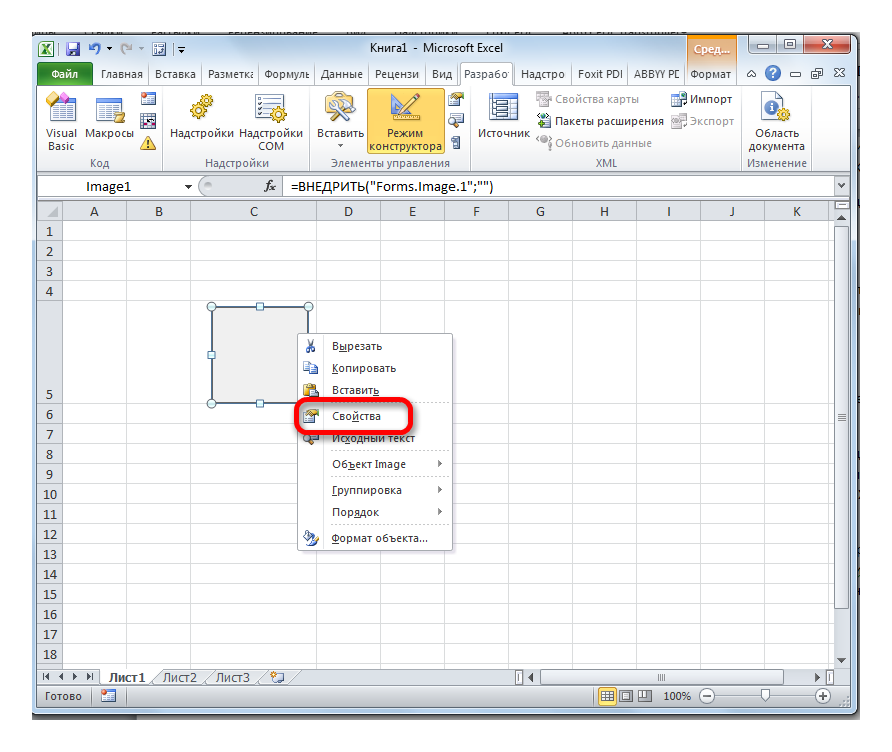 - В ленте «Разработчик» нужно перейти к вставке объекта ActiveX, выбрав при этом изображение.