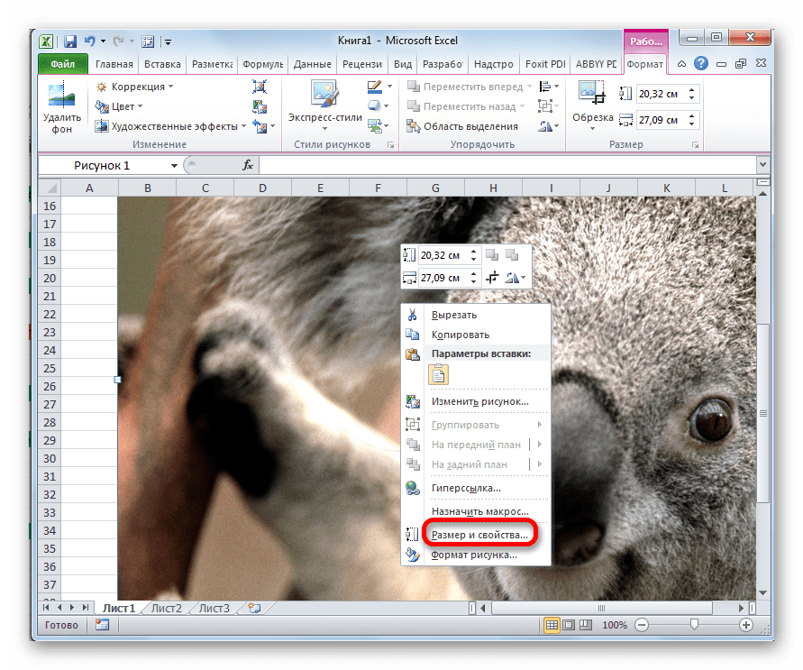 - Надо кликнуть правой кнопкой мышки по рисунку и в контекстном меню выбрать строку «Размер и свойства».