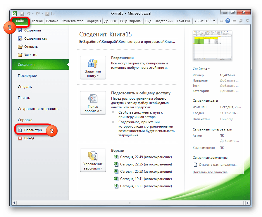 Этот режим по умолчанию не является активированным. Чтобы им воспользоваться длязакрепления картинки в ячейке, в главном меню в ленте «Файл» переходят к параметрам.