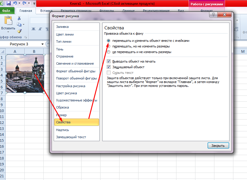 - Далее необходимо перейти на вкладку «Свойства». В верхнем переключателе выбирают строку, соответствующую тому, что объект будет перемещаться вместе с соответствующими клеточками. Отмечают оба чек-бокса («Защищаемый объект» и «Выводить на печать»).