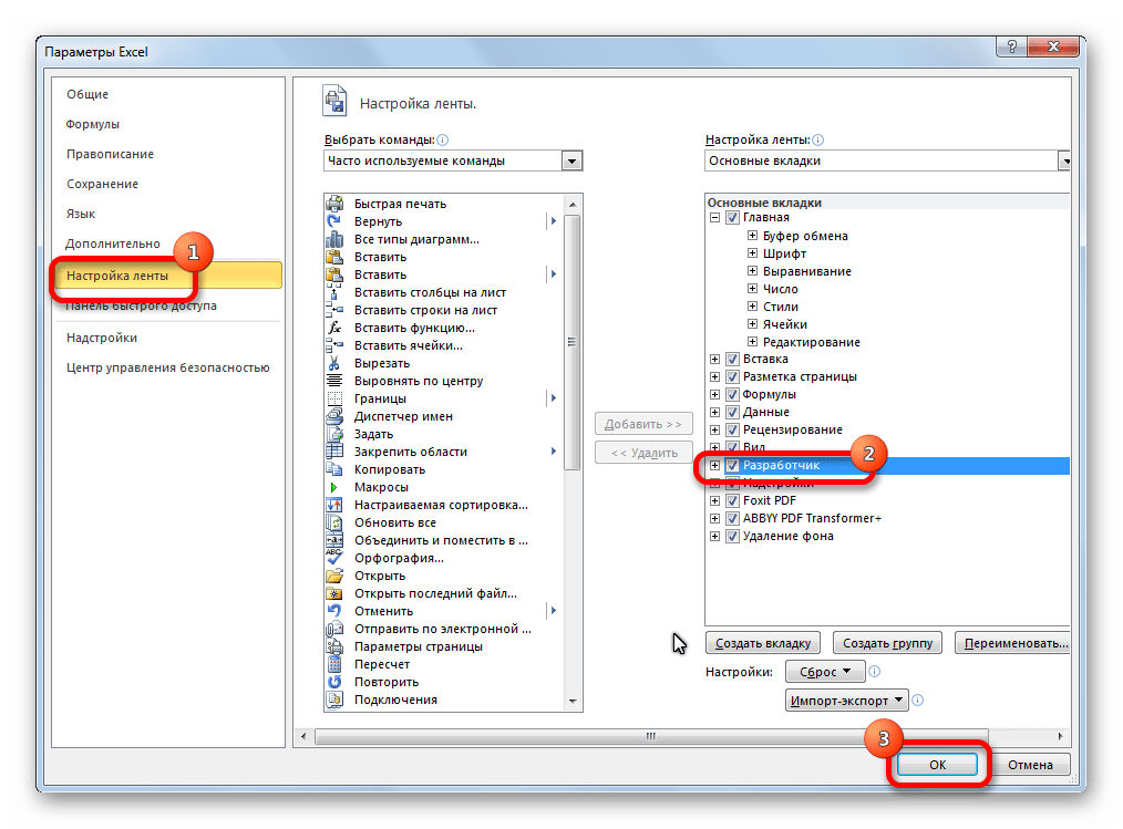 В разделе «Параметры» выбирают настройку ленты и ставят галочку напротив строки «Инструменты разработчика».