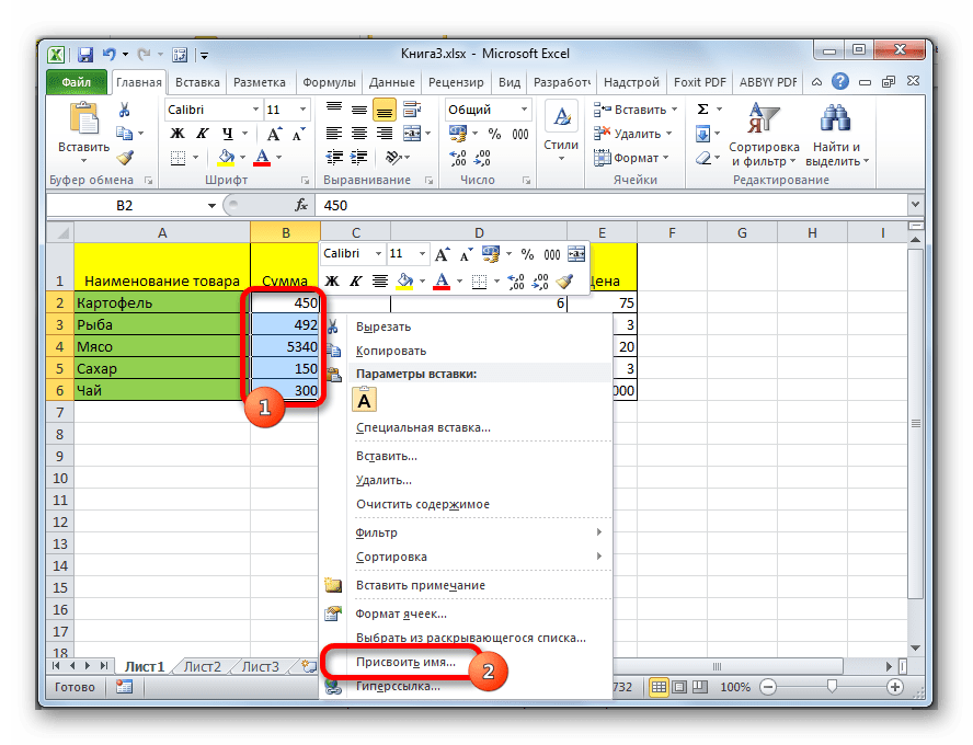 Довольно распространенным способом присвоить наименование ячейкам является использование контекстного меню.