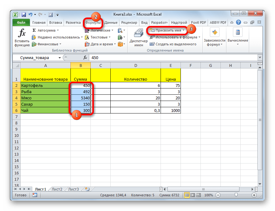 - В области Определенные имена на вкладке Формулы ленты меню нажимаем кнопку Присвоить имя;