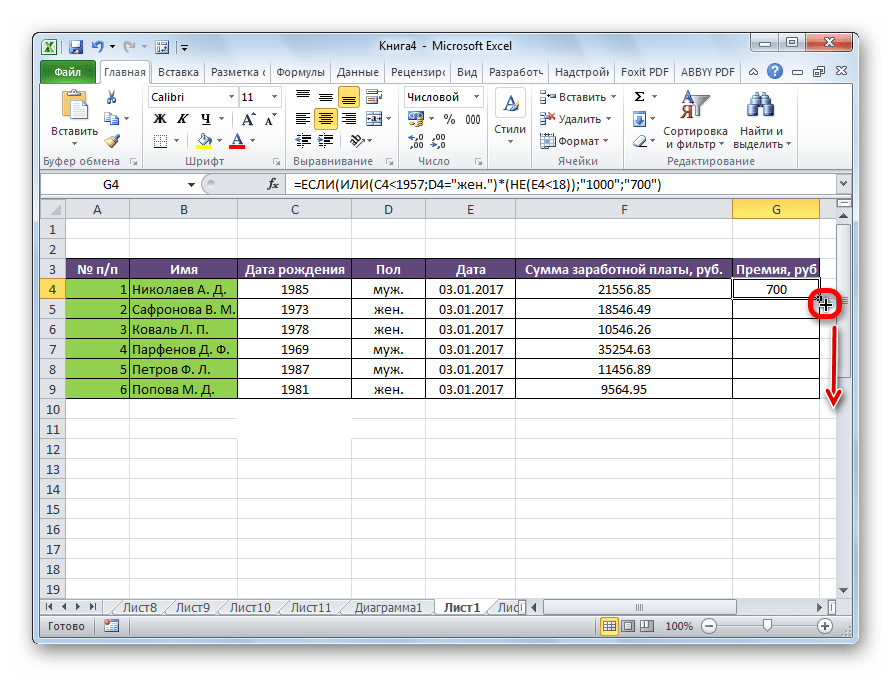 Попробуем составить формулу. Итак, у нас существует два условия, при исполнении которых положена премия в 1000 рублей – это достижение пенсионного возраста или принадлежность работника к женскому полу. При этом, к пенсионерам отнесем всех тех, кто родился ранее 1957 года. В нашем случае для первой строчки таблицы формула примет такой вид: =ЕСЛИ(ИЛИ(C4 . Но, не забываем, что обязательным условием получения повышенной премии является отработка 18 дней и более. Чтобы внедрить данное условие в нашу формулу, применим функцию НЕ: =ЕСЛИ(ИЛИ(C4 .