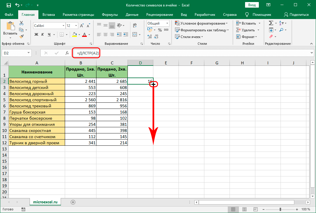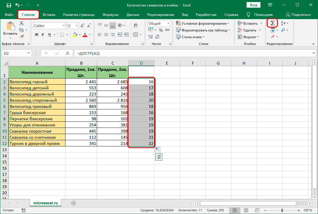 После этого во всех соседних от столбца клетках появятся результаты расчета количества символов из отдельных строчек.