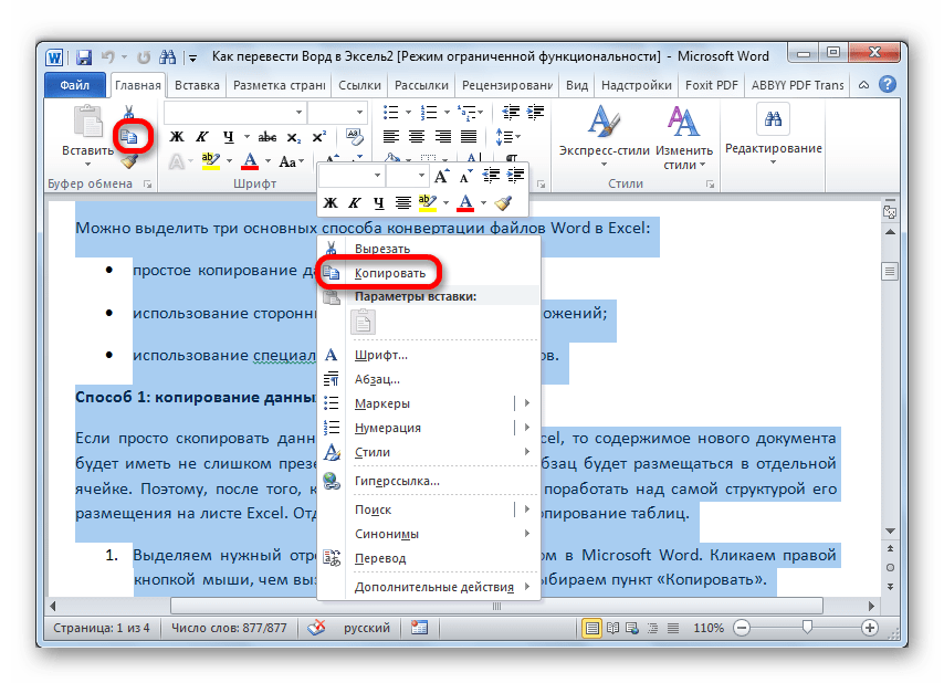 - Выделяем нужный отрезок текста или текст целиком в Microsoft Word. Кликаем правой кнопкой мыши, чем вызываем контекстное меню. Выбираем пункт «Копировать». Можно вместо использования контекстного меню, после выделения текста, кликнуть по кнопке «Копировать», которая размещается во вкладке «Главная» в блоке инструментов «Буфер обмена». Ещё одним вариантом является после выделения текста нажатие комбинации клавиш на клавиатуре Ctrl+C.