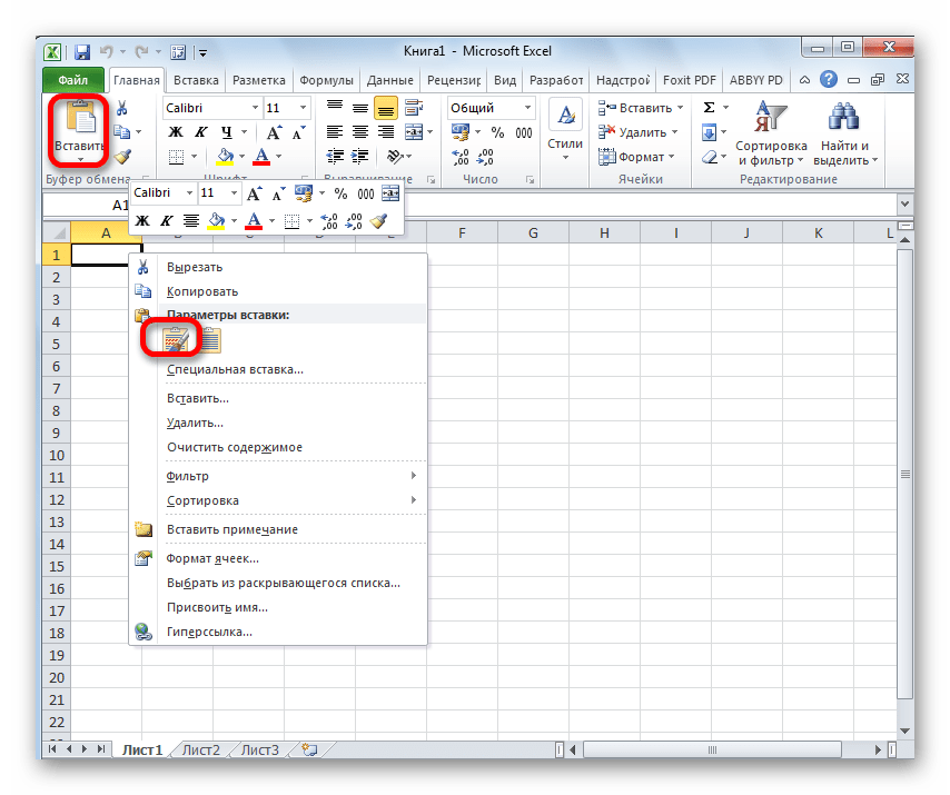 Открываем программу Microsoft Excel. Кликаем ориентировочно по тому месту на листе, куда собираемся вставить текст. Правым кликом мыши вызываем контекстное меню. В нём в блоке «Параметры вставки» выбираем значение «Сохранить исходное форматирование».