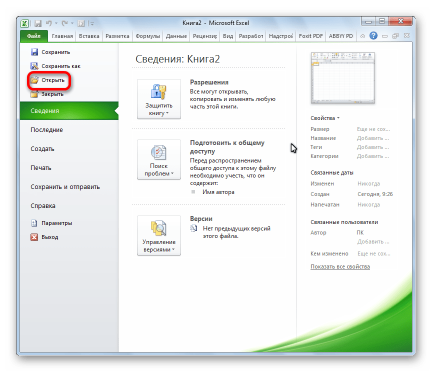 Открываем программу Эксель во вкладке «Файл». Выбираем пункт «Открыть».