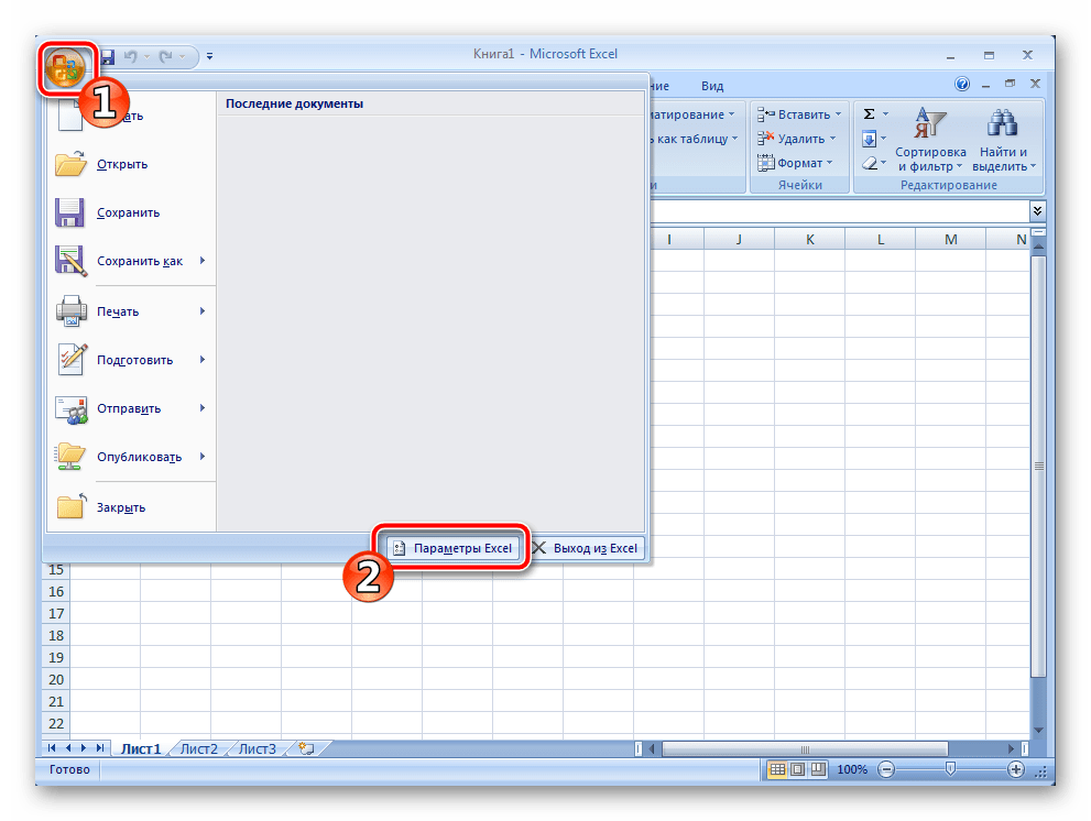 - Слева вверху окна находится кнопка «Меню». Нажмите ее и перейдите в «Параметры Excel».