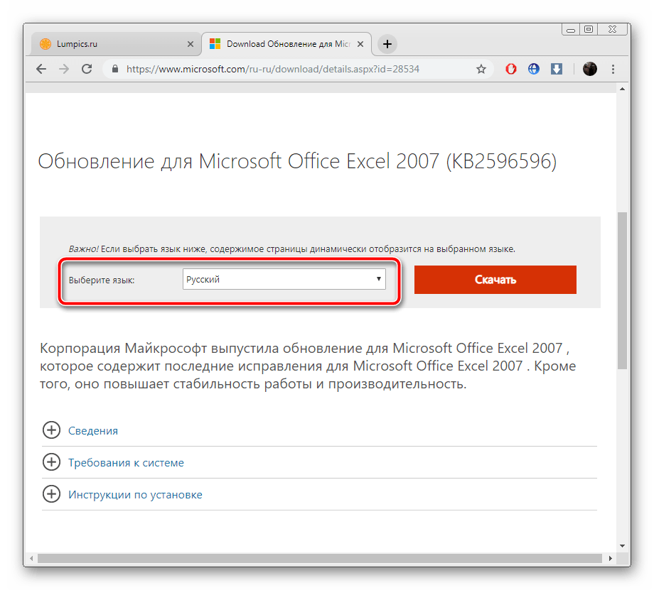 Компания Microsoft на своем официальном сайте выкладывает файлы загрузок, чтобы при необходимости пользователь мог скачать их и установить вручную. За время поддержки работы Excel 2007 было выпущено одно крупное обновление, исправляющее некоторые ошибки и оптимизирующее программу. Поставить его на ПК можно следующим образом: