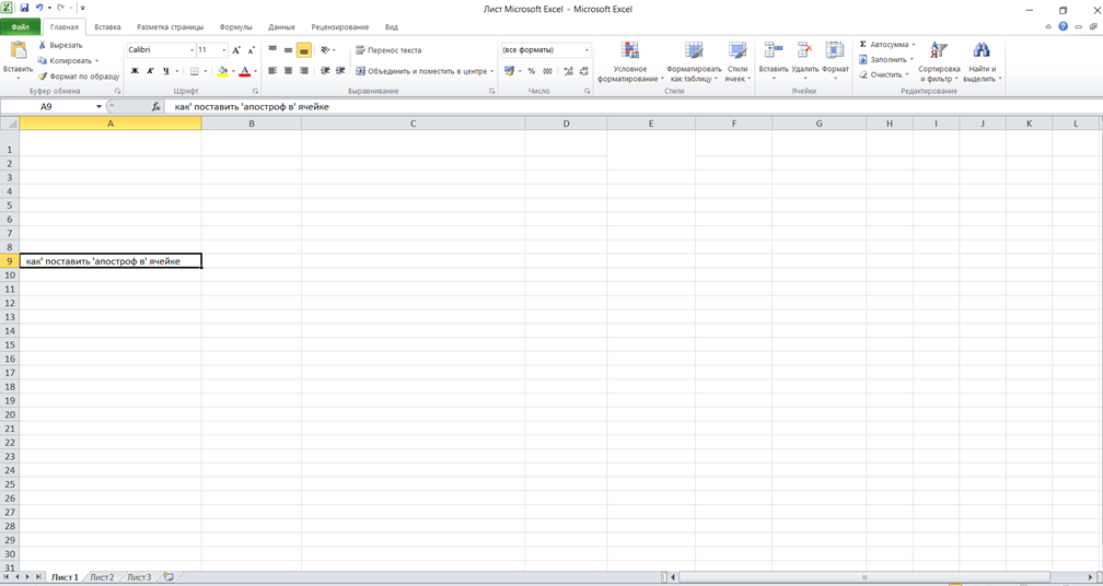 Разобравшись, что такое апостроф в Excel, нужно понимать, что вставить этот значок возможно в требуемую область рабочего поля, не обязательно перед текстом или числом