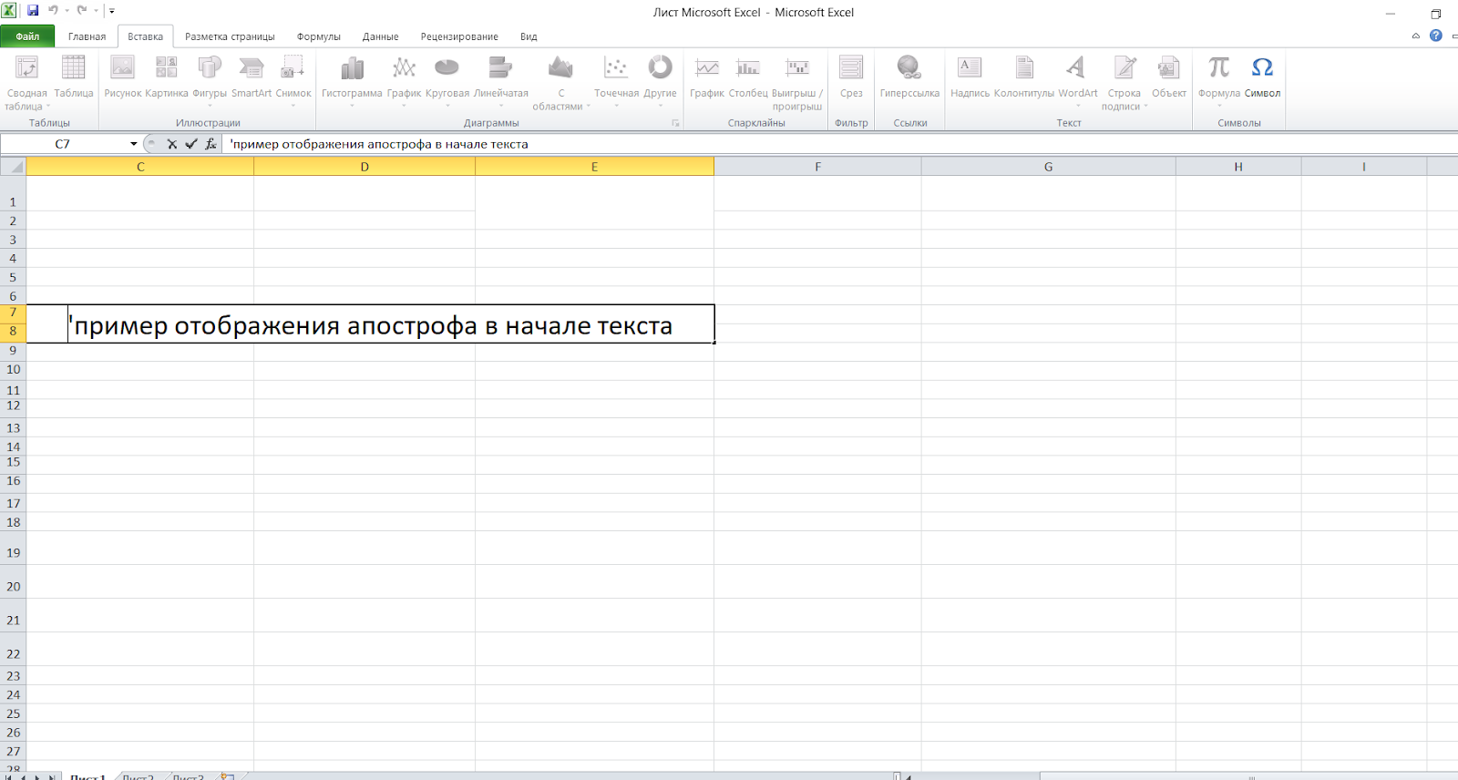 Использование таблицы символов покажет, как ввести апостроф в Excel в различных видах начертания. В рабочем секторе печатают информацию, выбирают «Вставка» → «Символы» → необходимый знак → «Вставить».