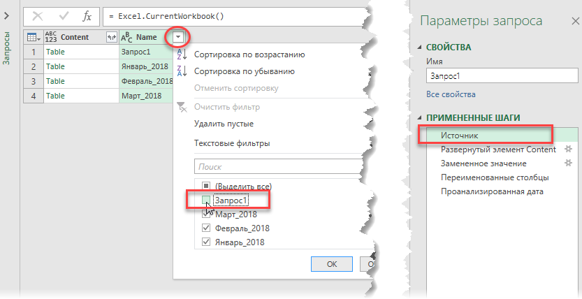 Короче, из запроса нужно исключить таблицу, которая получается на выходе (Запрос1). Есть разные подходы, самый простой – это добавить шаг фильтрации. Выделяем в правой панели первый шаг Источник, открываем фильтр в колонке с названиями, снимаем галку с таблицы Запрос1 → Ok.