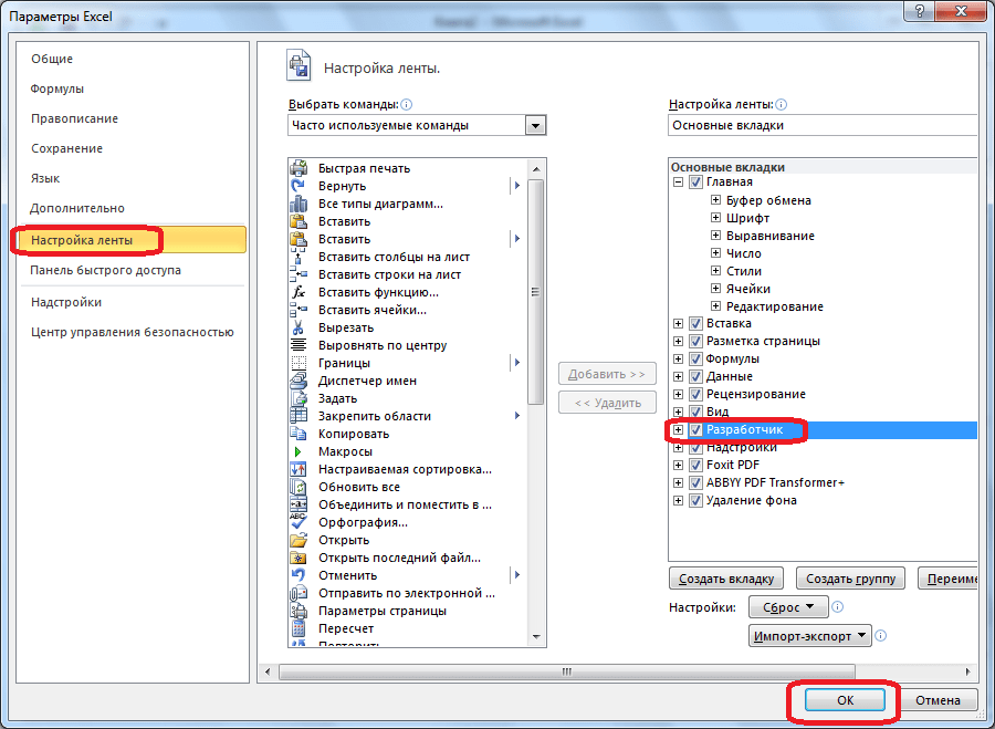 - В окне настройки параметров Excel во вкладке «Настроить ленту» поставьте галочку напротив вкладки «Разработчик».