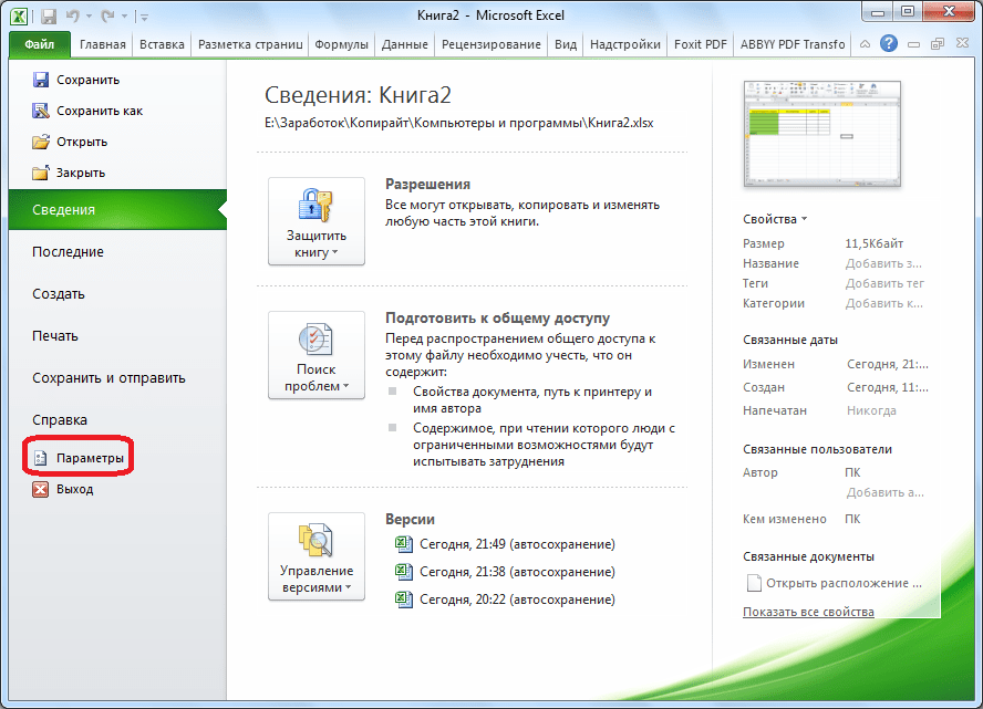 Второй способ предполагает создание выпадающего списка с помощью инструментов разработчика, а именно с использованием ActiveX. По умолчанию, функции инструментов разработчика отсутствуют, поэтому нам, прежде всего, нужно будет их включить. Для этого, переходим во вкладку «Файл» программы Excel, а затем кликаем по надписи «Параметры».