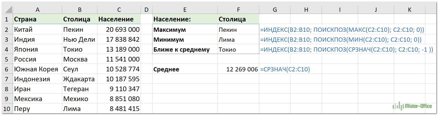 Предположим, нам нужно в списке городов найти столицу с самым большим населением. Чтобы найти наибольшее значение в столбце С и вернуть соответствующее ему значение из столбца В, находящееся в той же строке, используйте эту формулу:
