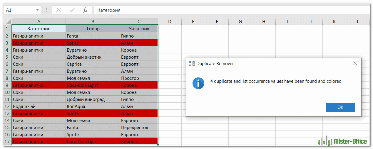 Если вам нужно больше возможностей для работы с дубликатами и уникальными значениями, используйте Duplicate Remover, который может находить дубликаты с первыми вхождениями или без них, а также уникальные значения. Подробные инструкции приведены ниже.