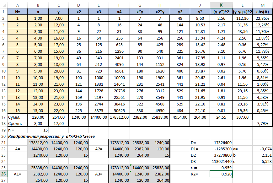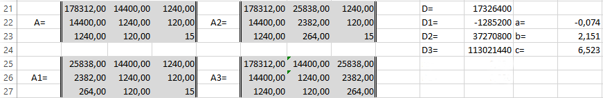 Расчёт коэффициентов уравнения по Крамеру будем производить в ячейках напротив соответствующих детерминантов по формуле: a (в ячейке M22) — «=K22/K21»; b (в ячейке M23) — «=K23/K21»; с (в ячейке M24) — «=K24/K21».