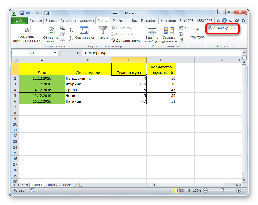 Перейдём во вкладку «данные» и выберем «Анализ данных»