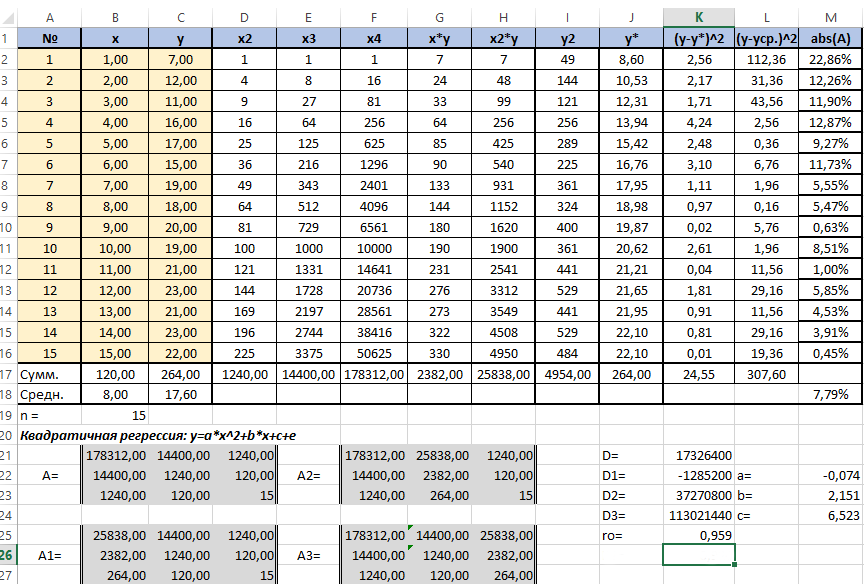 Осталось оценить качество подгонки полученного квадратичного уравнения регрессии (индекс детерминации). Он рассчитывается по формуле квадрата индекса корреляции. То есть формула в ячейке K26 будет очень проста — «=K25*K25».