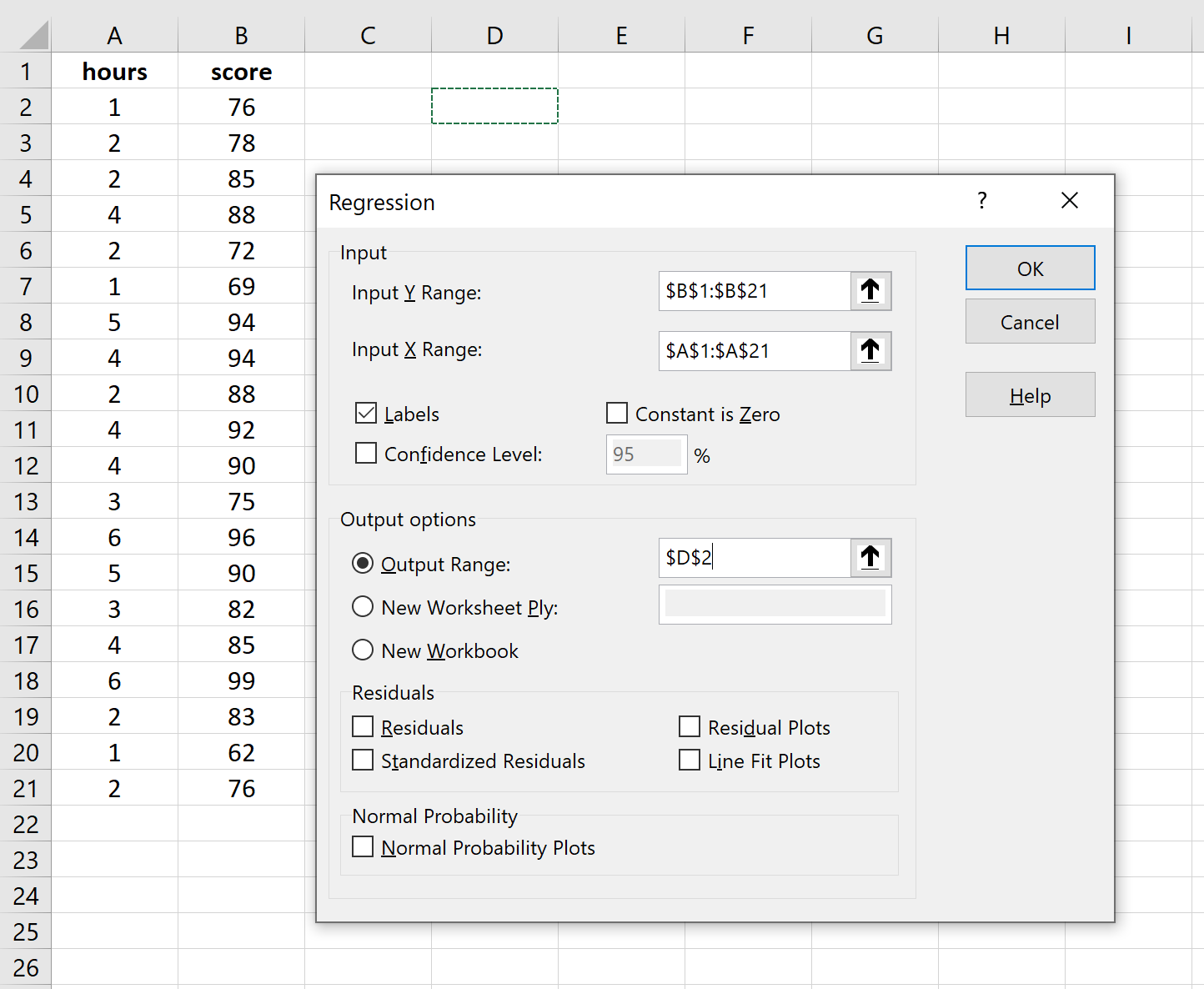 Установите флажок рядом с Метки , чтобы Excel знал, что мы включили имена переменных во входные диапазоны.