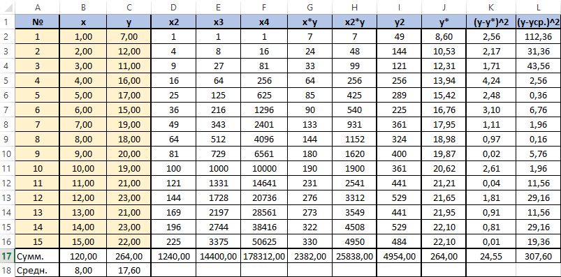 Для вычисления добавим в таблицу дополнительный столбец J (назовём его y*). Расчёта будет следующей (согласно полученному нами уравнению регрессии) — «=$m$22*B2*B2+$M$23*B2+$M$24». Поместим её в ячейку J2. Останется протянуть вниз маркер автозаполнения до ячейки J16.