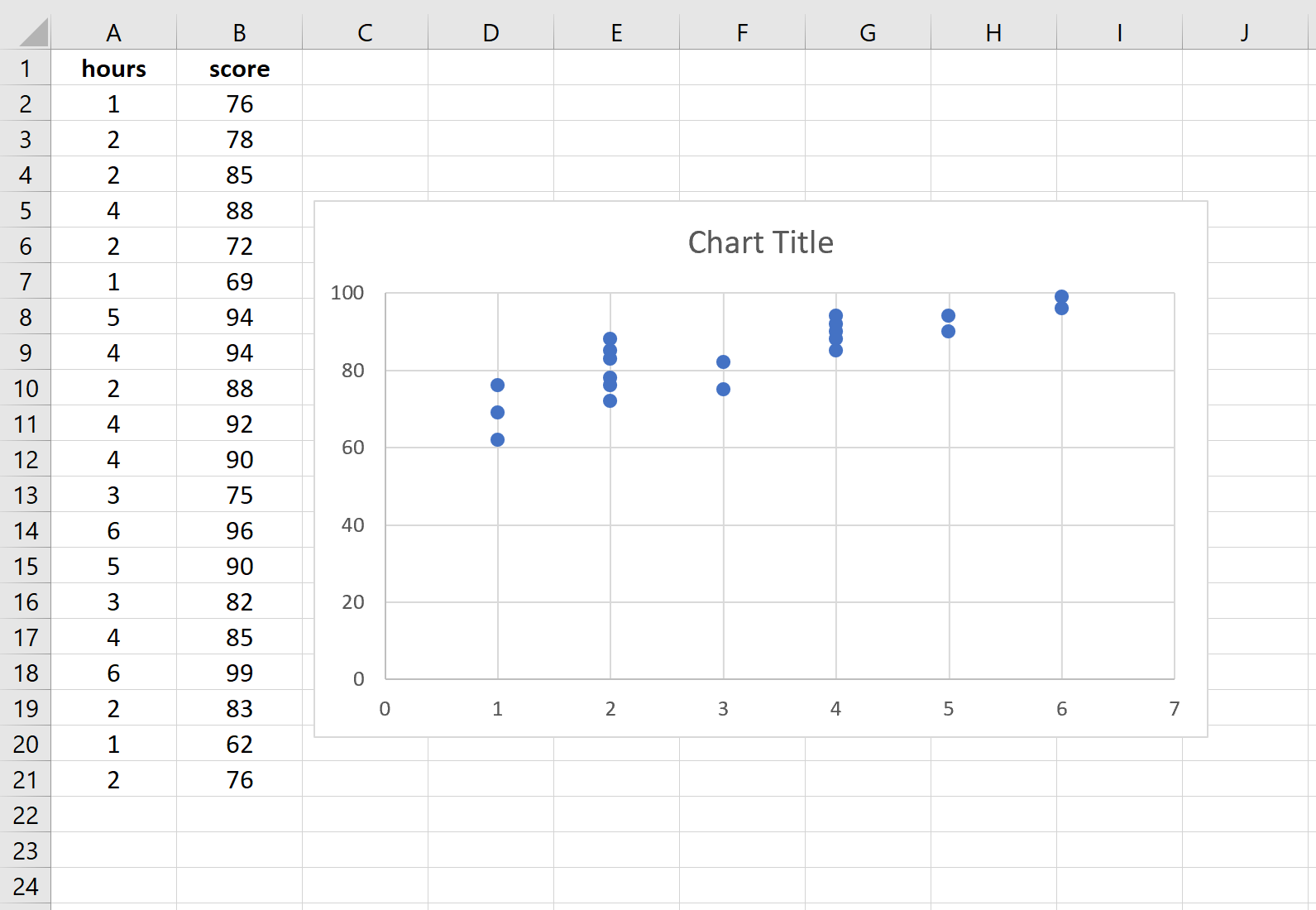 Прежде чем мы выполним простую линейную регрессию, полезно создать диаграмму рассеяния данных, чтобы убедиться, что действительно существует линейная зависимость между отработанными часами и экзаменационным баллом.